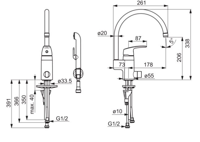 Cмеситель для кухни с высоким поворотным изливом c ручным душем Bidetta и клапаном для посудомоечной машины Угол поворота излива 120°, может быть изменен. Клапан для посудомоечной машины с подводом холодной воды. Двухкомпонентная прочная рукоятка обеспечивает удобство использования. Встроенные опции ограничения температуры и напора воды.