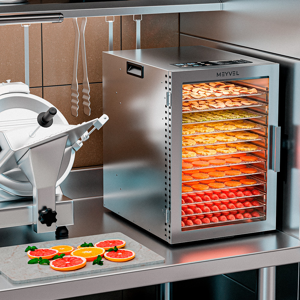 - Для фермеров и дачников. Модель Meyvel MDH12-1S (Нержавеющая Сталь) (Inox) справится с переработкой сезонных запасов. Можно за один цикл высушить урожай фруктов, грибов или овощей без потери вкуса и аромата.