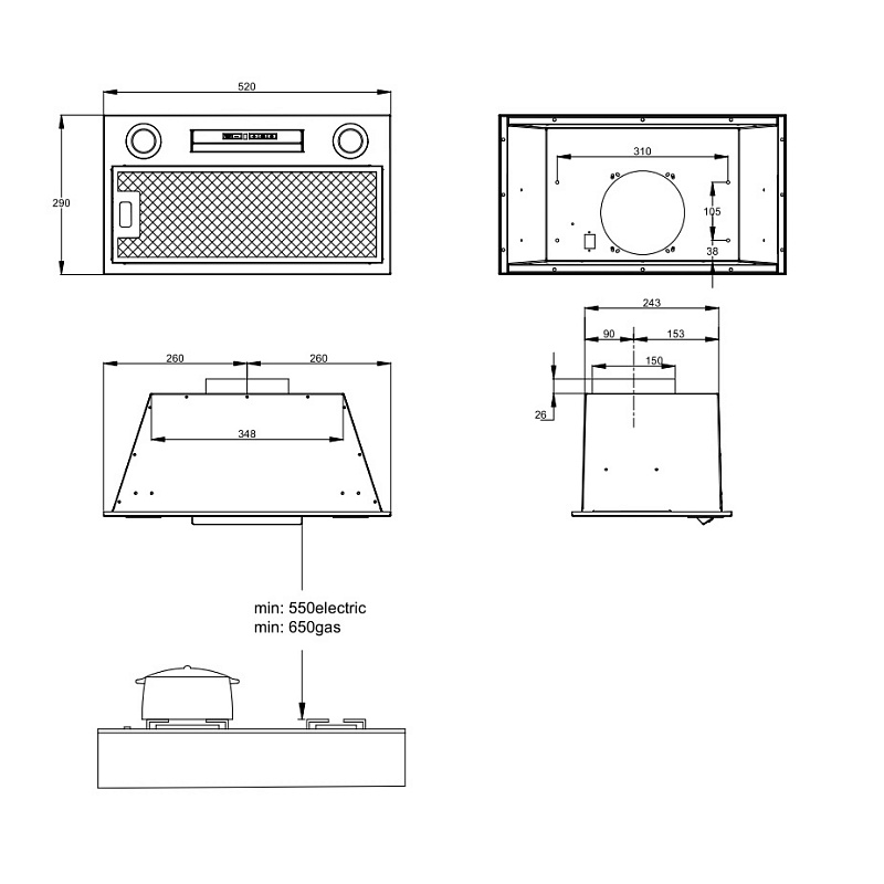 Следует учитывать и соотносить размеры вытяжки с размерами варочной поверхности. Вытяжка должна быть не меньше, чем сама поверхность. Ширина вытяжки 60 см отлично подходит к варочным поверхностям на 60 см или 45 см.