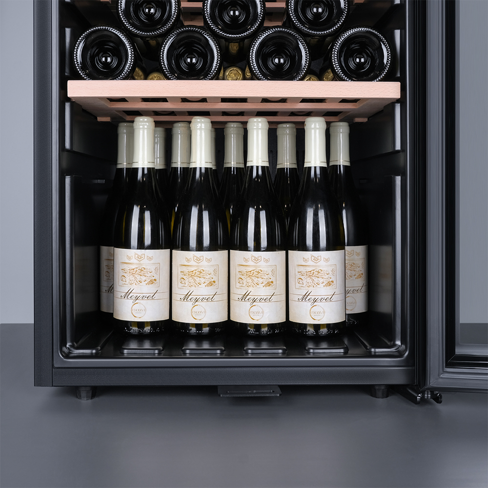 Meyvel MV98-KBF2 оборудован двумя температурными зонами, чтобы эффективно хранить различные сорта вин. В верхней зоне температура регулируется в диапазоне от +5 до +12°C, которая идеальна для белых вин и шампанского. Нижняя зона предлагает температурный режим от +12 до +20°C, подходящих для красных вин. Это обеспечивает индивидуальный подход к каждому виду вина. Благодаря большому расстоянию между полками в шкаф помещаются не только бутылки 0,75 л типа «Бордо», но и большего объема. Бутылки также можно установить стоя.